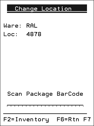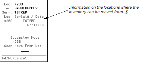 This allows the warehouse operator to move inventory from one location to another. This option prompts for the location, then the items within the location. All orders allocated to the material moved are adjusted in real time. This option only allows you to move all the inventory. It does not allow you to split an order. For more information, refer to Changing Locations with an RF Device. |