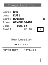 This option, designed for rolled goods, allows a warehouse operator to move inventory from one location to another. It prompts for the serial number first. All orders allocated to the material moved are adjusted in real time. This option only allows you to move all the inventory. It does not allow you to split an order. For more information, refer to Changing Locations with an RF Device. |
