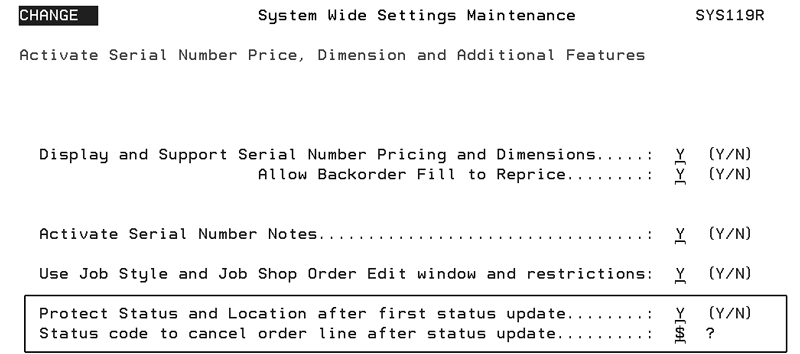 6. Enter Y or N in each of the fields circled. If, as shown above, all the fields are set to Y an order will not be updated until all five (Item#, S/N#, BadgeID, To Loc, and From Loc) of the applicable components have been scanned.