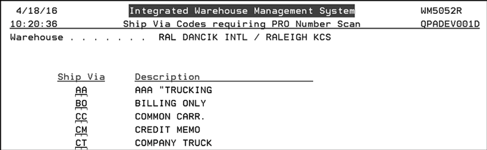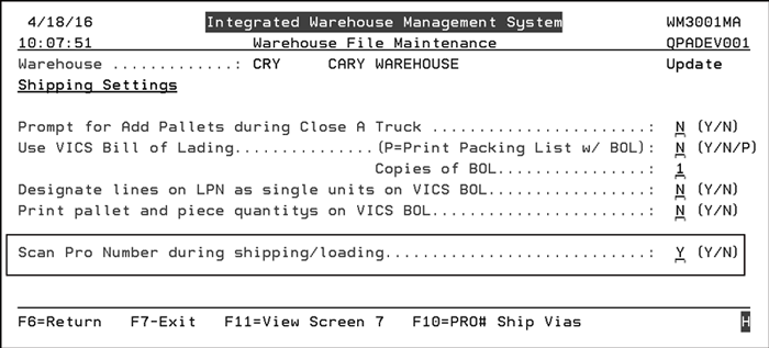 Notice the F - PRO# Ship Vias function at the bottom of the screen. This function allows you to enter the ship vias that require a PRO number to be entered.