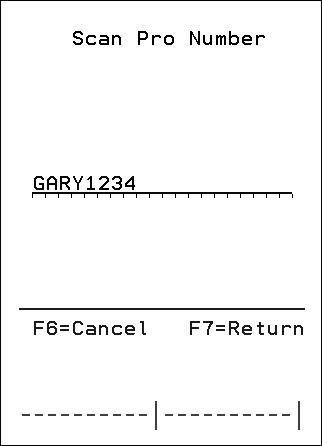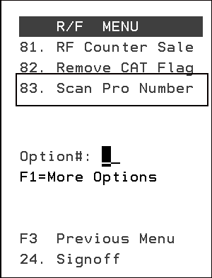 This RF function, 83 - Scan Pro Number, allows you to scan a PRO number on demand.
