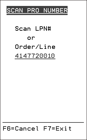 3. This option allows you to scan a PRO number on demand; if the order and LPN are valid and a valid combination. In the example shown below, an order and line number were scanned.