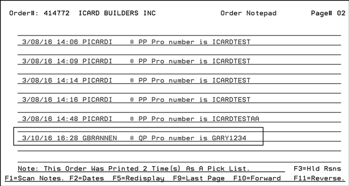 5. If the PRO number was entered for an order, the PRO number is inserted in the order’s notepad.
