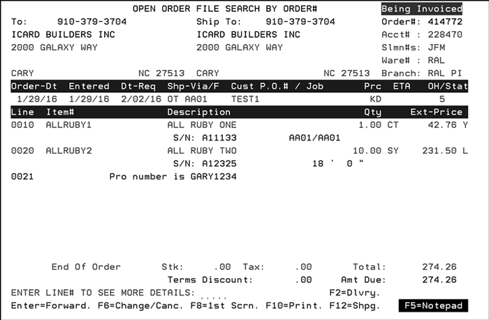 6. Press F2 to access the shipto information.