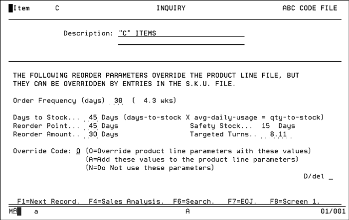 This field determines whether or not, and how, the order frequency, weeks to stock, reorder point, and reorder amount fields in this record are used by the reorder reports and purchasing system. When a reorder report or automatic reordering is run, the system first retrieves reorder parameters from the Product Line File for each item. Then, based on the item’s ABC Code, the ABC File reorder parameters are checked. If the override code is O, the ABC Code File parameters are used instead of the Product Line File parameters. If the override code is A, the ABC Code File parameters are added to the Product Line File parameters. The system then checks the SKU File, which can further override these parameters. |