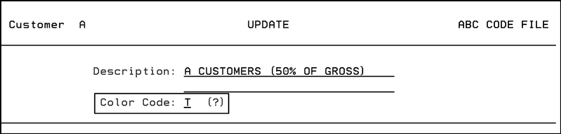 If in the update mode, you can press F1 to enter the current screen and go to the next ABC code record in the file. If in the inquiry mode, you can press F1 to display the next ABC code record in the file. |
