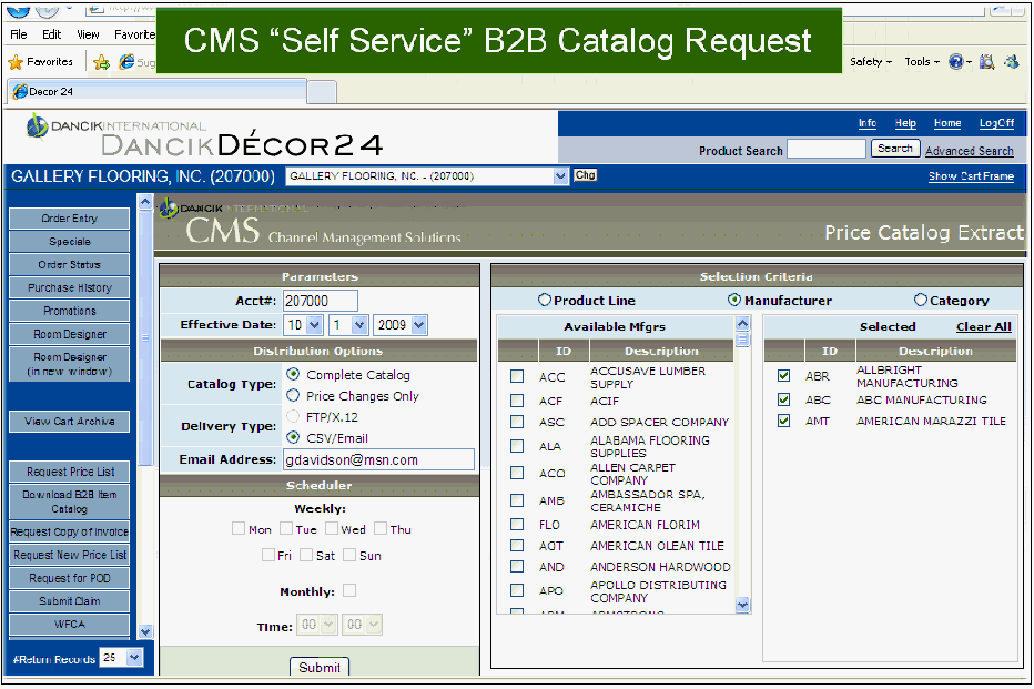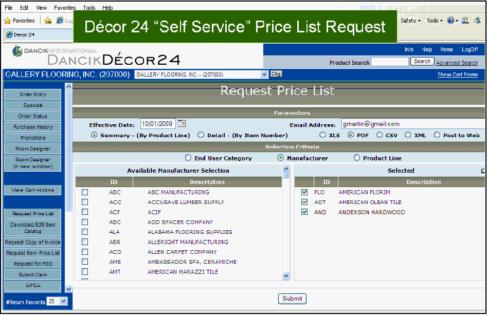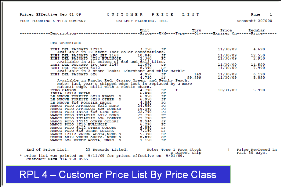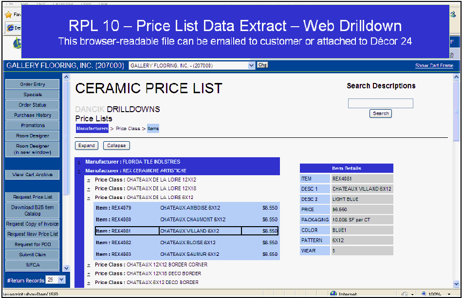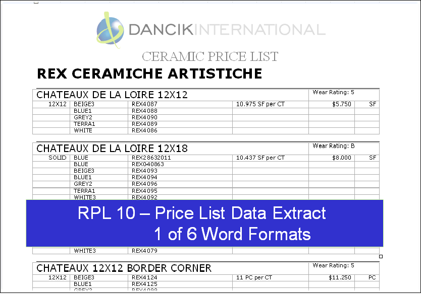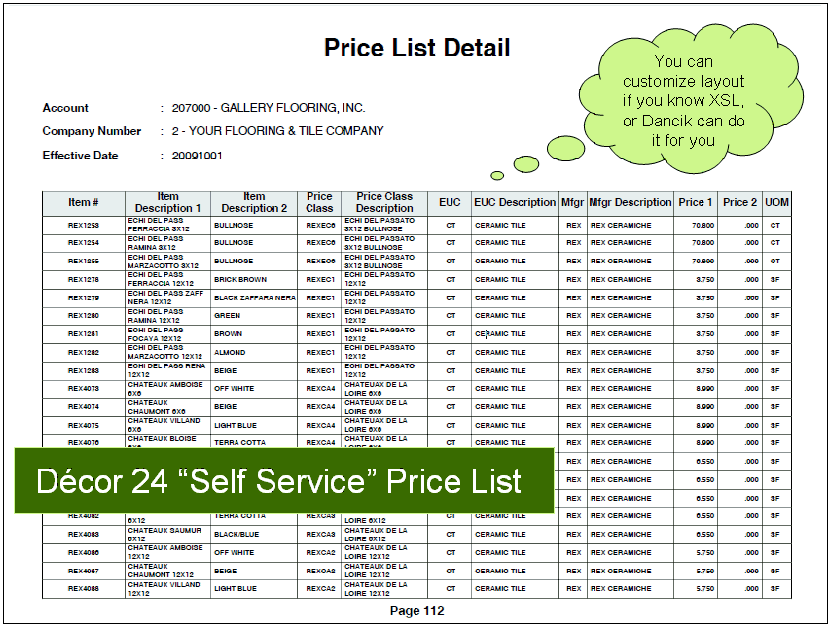 Can produce very nice output with your own fonts. But there is a learning curve and many users have never learned all the features. You extract the data and manipulate as needed. Dancik provides 6 standard formats that do not require customization. Best use case is for non-customer specific price lists. Output can be attached to Decor 24. |