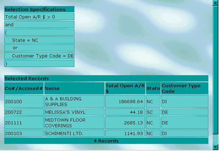 In addition to the company number, account number, and name, the tables shows all fields that are used in the selection specifications.