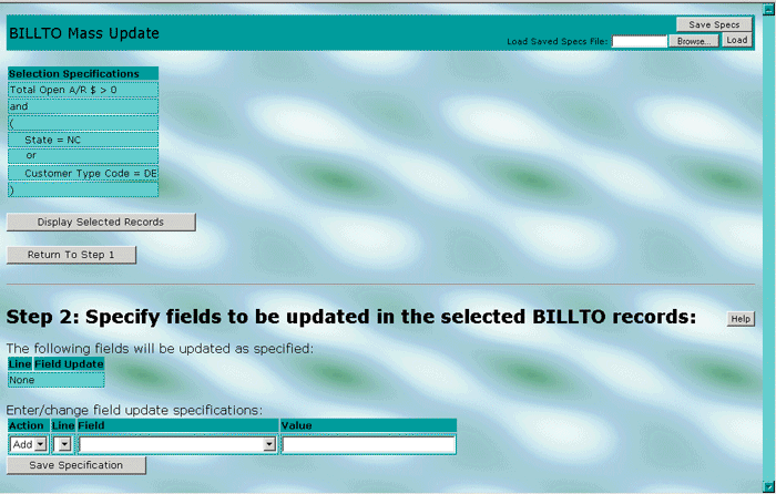 You can save specifications, so that you can update records later or modify them to perform a similar mass update.