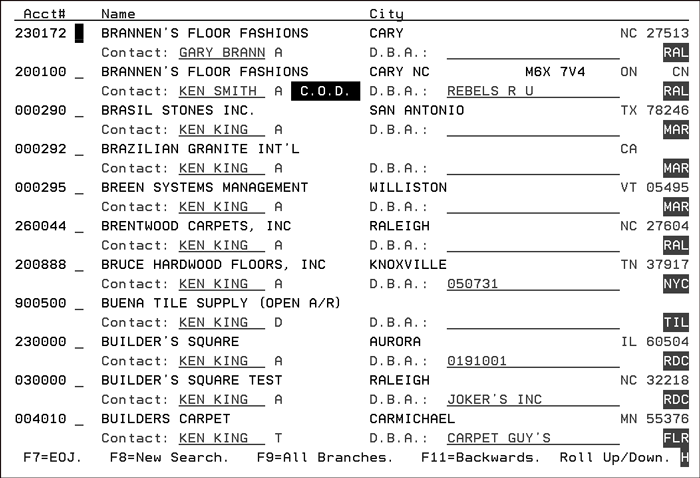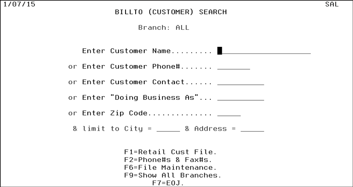 Note: If you go to the Billto File via a hot key from a program where you have selected a transaction or record that refers to a customer account number, the system bypasses this screen and displays the Billto File Profile screen.