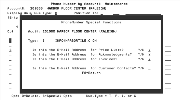 If the customer or business is known by another name, enter that name in this field. You can also use this field to enter the customer’s name in other ways. For example, if a customer name is The Tile Outlet, you can enter it as Tile Outlet, The in this field. The Customer Search finds it if you search for “The” or “Tile.” If a customer name is a person’s name, enter last name first in this field and first name first in the Name field. For chain stores, you can enter the store number in this field followed by an abbreviation of the name. For example, 1023JCP for JC Penney store 1023, or 358HOM for Home Depot store 358. Then, you can search by store number. To help customer service switch from using old to new account numbers, you can enter old account numbers in the Doing Business as (DBA) field. You can search this number during order processing to help ease the transition for users who have memorized old codes that can not be used in the new system. You can use this field to differentiate among national account stores for whom you enter orders that are invoiced to multiple manufacturers. Because you need to create the same account for the different manufacturers, you can use the DBA field to separate the accounts. For example, Home Depot #515 (HAR) and Home Depot #515 (SHA). |