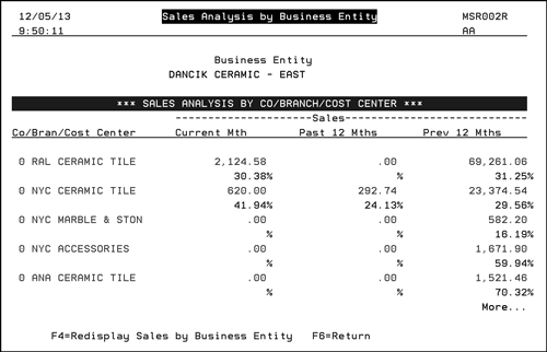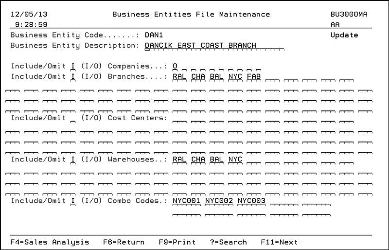 In the example above, the business entity “Dancik East Coast Branches” includes five branches within Company #0, and all cost centers. This business entity is also limited to four warehouses and some general ledger “combo codes”.