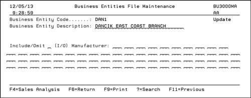 3. Enter U in the appropriate Opt field to update a Business Entity.