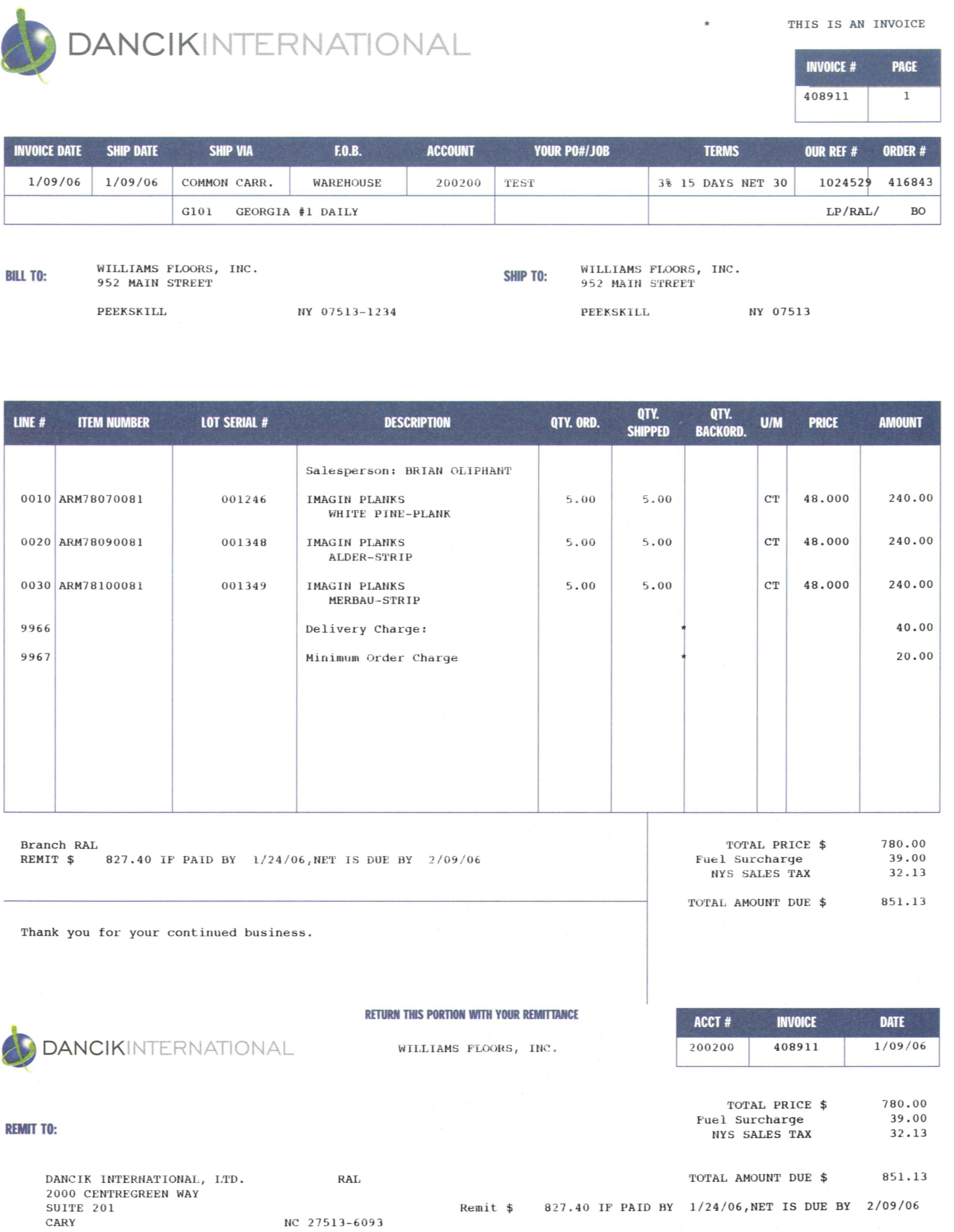Notice the Fuel Surcharge in the payment area of the invoice. This text/term can be changed via the System Wide Setting - Options for Handling Charges. The default term is Handling Charges. By changing the term to Fuel Surcharge, you may effectively create a fuel surcharge that is a percentage of the invoiced amount. You can change the term as needed to recoup expenses such as fuel surcharges. The invoice on the following page shows the term Fuel Surcharge where Handling Charge would normally appear.
