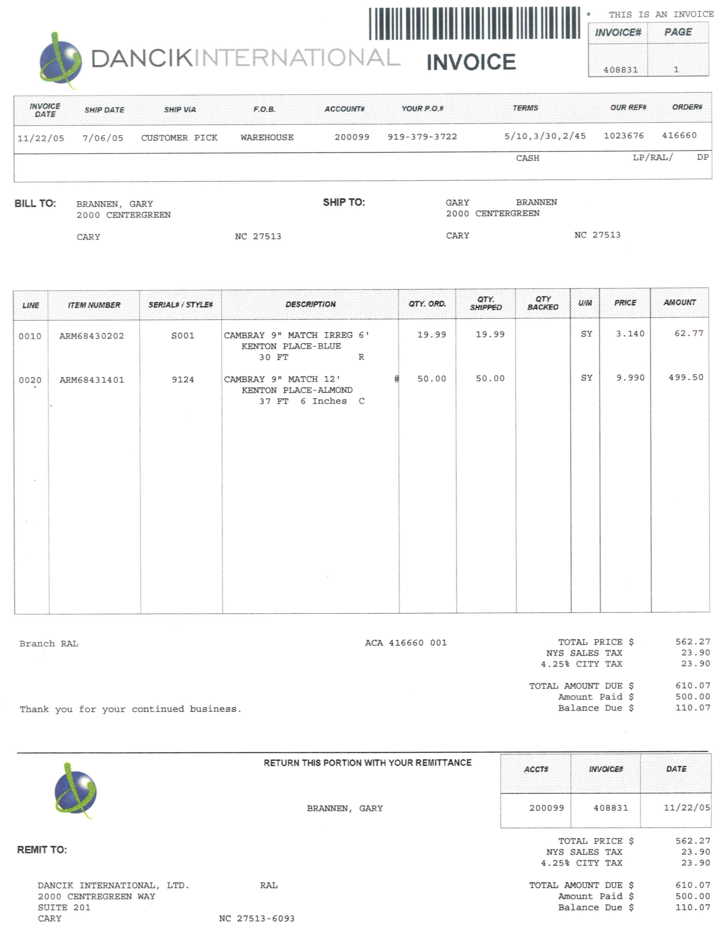 Invoice number is bar coded, enabling you to scan invoices into a document retention system.