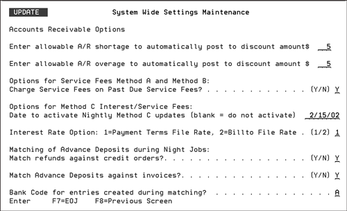 Defines what AR payment variances are automatically accepted by the system without balancing further. You can enter Accounts Receivable system settings for automatically clearing small payment discrepancies while applying cash. You can set an allowable underpayment limit, and an allowable overpayment limit, which is tested on a check by check basis while applying cash. This option allows you to enter the allowable shortages and overages to automatically discount when applying cash. These shortages and overages should be entered in full dollar amounts only. These amounts are allowed on a check by check basis. Two parameters that pertain to Method C Interest/Service Fees and three options that pertain to Auto-Matching of debits and credits are included in this setting. Method C is an alternative to Method A and Method B interest/service charge processing. Parameters have also been added to control the AR Auto-Matching program which automatically matches credits and debits for the same order on AR.