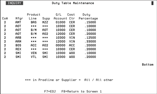 The duty rate has to be manually entered. If a duty rate percentage is not entered, a duty cost is not charged. The program computes the duty amount, by multiplying total value ordered by the duty percent, and then allocating to each item based on the relative value of each item. Note Build-A-Container is option 19 on the Purchasing menu. Container are entered using option 1 on the Build-A-Container menu.
