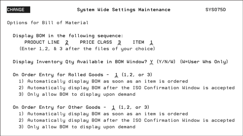 In order to fully use the capabilities for Bill of Materials, you must first make entries under the System Wide Setting - Options for Bills of Material. This system wide setting presents you with four options for displaying bills of materials (BOMs). Use these options to control when and how the a bill of material is displayed.