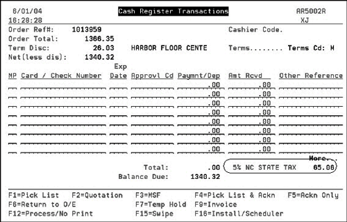 Note: The Cash Register screen only appears at work stations where the Control Panel is set to Cash Register Screen = Y. Displaying Tax Information on the Cash Register screen - This option controls the display of taxes on the cash register screen is at the bottom of the Cash Register Environment Options screen. For example, if both state & local taxes were charges, it could show:
