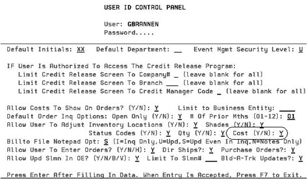 The user has to be granted permission to update cost through the Allow User To Adjust Cost on the User ID Control Panel (SET 2). Associated Files