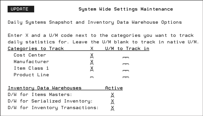 These statistical snapshots are taken during the night jobs, except for inventory receipts which are taken when receipts are posted. There are four categories of statistical snapshots: Cost Center, Manufacturer, Item Class 1, and Product Line. Select the categories relevant to your operation. The disk space requirement is minimal for all categories except perhaps Product Line, which can consist of many records depending on your data setup. The Daily System Snapshots File consists of one record per day, per category selected. For manufacturers, we recommend that all categories are selected. The Daily System Snapshots Analysis Report includes your vital sales, ordering, production, and inventory information on a single page. Distributors, importers and retailers should select only the categories to be monitored on a daily basis. To select any of the four categories, enter an X in the selection field. You can optionally enter a UOM code for all selected categories. The UM code you enter causes all quantity statistics to be converted to that particular UM. When there is no conversion factor found, the program assumes a conversion factor of zero and the quantity is not included. The UM option is an important feature because it allows you to track total market penetration in a single common UM. For example, if you sell vinyl tiles, ceramic tiles, and carpet, you can track those in cartons, square feet, and square yards respectively. The ceramic tile may have some items sold in square feet, but others in pieces and sheets. By specifying square feet (SF), you can monitor all these different products in a single unit of measure. The Daily System Snapshots File contains sales dollars and gross profit figures, as well as quantities. Inventory Data Warehouse Options The options on the bottom part of the screen activate the Data Warehouses. For more information on Data Warehouses, click here. |