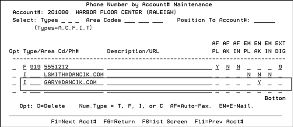 Note Phone number entries are designated via the Type field of the Phone Number File. The Phone Number File is accessed via F10 on the Billto File (FIL 1).