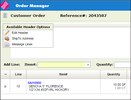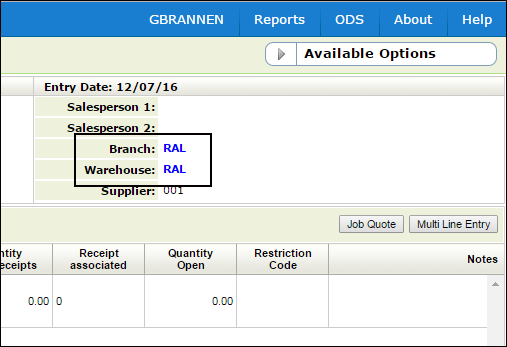 When set to Y, update the branch on the order header to the header warehouse during order entry. Restrictions: This functionality does not apply to direct orders, purchase orders, or stock transfers. Editing Branch and/or Warehouse Both the Branch and the Warehouse can be changed by editing the Order Header. Click the option arrow to the far left of the order header, and select Edit Header.