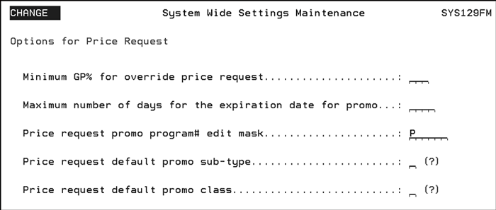 Minimum GP% for override price request - Enter the minimum amount, based on GP%, for a pricing override to be accepted. Maximum number of days for the expiration date for promo - Enter the maximum number of days from the current date that the expiration date of the promo created may be in effect. Price request promo program# edit mask - This option allows you to add a mask to the program numbers created by this process. The remaining characters after the edit mask will be populated by a revolving number wheel.