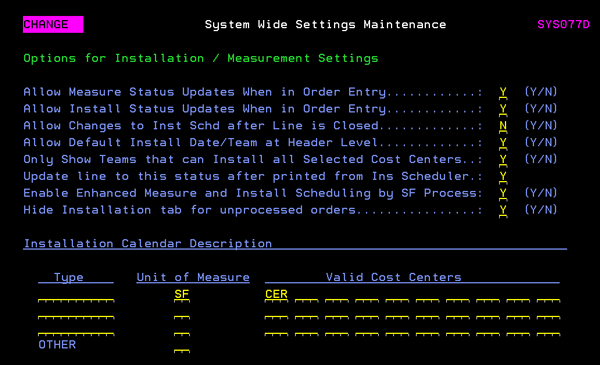 Note: The order can also be checked via menu option CUS 10 on the green screen. Enable Enhanced Measure and Install Scheduling by SF Process - When set to “Y”: