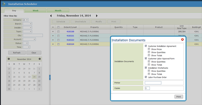 If an option is set to N, it will not display within the Scheduler/Status feature during order entry. Setting the option Allow Changes to Installation Scheduler after Line is Closed to N prevents any installation or measurement updates or changes to a closed (invoiced) line via the Installation Scheduler. Update order line to this status after printed from Installation Scheduler - Enter the status code, in this example it is “S” for shipped, that the order line will be updated to when installation scheduler documents are printed. Follow this path to get to the Installation Scheduler Documents window: