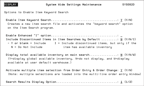 Entering a Y in the Enable Item Keyword Search field activates the keyword search option. Furthermore, it enables night jobs to rebuild the search file every night. Note Rebuilding the item search file should be done during night jobs. The amount of time needed to rebuild the file varies depending on the amount of items in your system, but it can take several minutes. By rebuilding the item search file every night, you are assured that any new items are included as well as any updates. Options