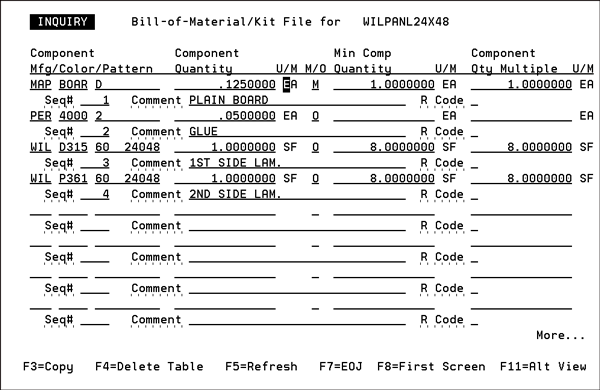 Enter a Y to activate the Light Manufacturing and Assembly System. This application combines Order Entry and Bill Of Material concepts, to process orders for light manufacturing and assembly of finished goods. The primary concept in manufacturing is finished goods being manufactured from components. This application relieves component inventories and adds to finished goods inventory. Finished goods items: New finished goods items are entered as regular items except that they MUST include policy code ‘S2’, to indicate the item is primarily manufactured to order. The standard costs entered for these items should be the ‘standard cost of manufacturing’. This standard cost should include all components and processes used to create the item, including labor. Finished goods items do not have to be completely precise. For example, for laminated panels, you can enter a unique item number for each type of board, board thickness, and class of laminate, but not for each specific combinations of items (which could be countless). As orders are taken, specific colors and sizes may be specified. No changes to the item file would be required. Component items: Component items are entered as regular items in the item file. No special codes are needed, as they can be sold as is, or as a component of a finished goods item. Bill-Of-Materials File: A BOM file entry is required for all finished goods (policy S2) items. The BOM should include an entry of each component that needs to be adjusted from inventory to create the item. Items in the BOM may be overridden. Include the most applicable (popular) component items, and then the user can override to specific choices when the item is ordered. All items should be entered with a quantity ratio of component quantity to finished goods quantity, when applicable. The following screen is an example of a light manufacturing bill-of-material. The only thing that differentiates light manufacturing Bills-Of-Material from other Bills-Of-Material is the policy S2 in the item file of the finished good items.