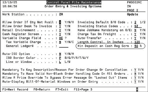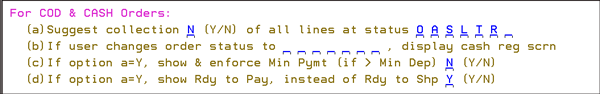 When accepting payment for an order, if the Enforce the Min Deposit % from Control Panel on Cash Register Screen? field is activated the system will not continue processing an order if less than 50% of the amount owed is paid. The statement Payment cannot be less than 50% of amount due appears at the bottom of the cash register screen. For COD & CASH Orders: These options, at the bottom of the screen, ensure that warehouse personnel remember to collect COD orders not paid in advance. The idea of these options is to show the user how much of an order must be paid at any point that the cash register screen is looked at. These options do not apply to Order Entry (since the status codes are not yet established), although the Min Dep% can apply as usual.