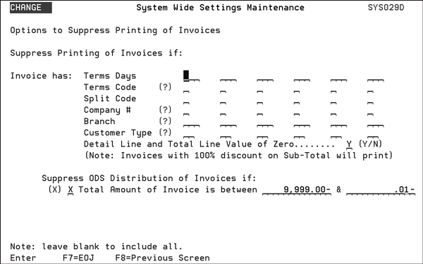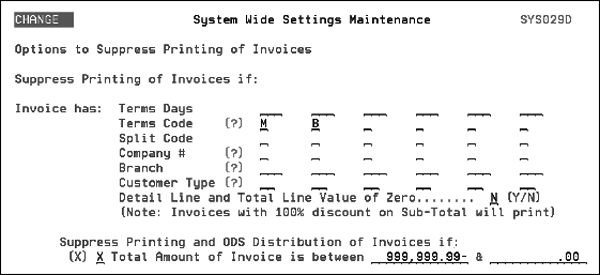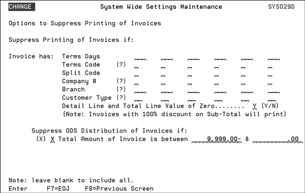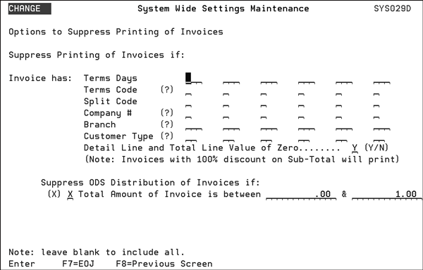 Note: The default for this screen is to leave all the values blank. For Y/N options the default is N. If an invoice meets the print suppression criteria it will not print. Note: An exception to this occurs in order entry. When entering in a 100% discount and an “L” is entered in the Where Extra Charge Shows field the invoice will not print if suppressing invoices when the Value of Zero field is set to “Y”. However, if an S is entered into the field the invoice will print. Note: Printing invoice copies via the F9 function from within Invoice Inquiry bypasses the options for suppressing invoices from printing. Consider the following examples for the use of the Suppress ODS Distribution of Invoices if setting. Example 1 The settings on this screen direct ODS to not send credit invoices, but send zero dollar invoices.