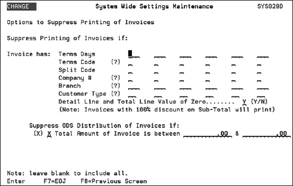 The System Wide Settings for Invoice Suppression options have an “and/or” relationship. For example, the option Terms Code has six suppression codes. If an invoice has one of these codes, it will be suppressed from printing. If multiple options have invoice suppression entries, they operate under an “or” type relationship. This system wide directs which invoices are printed using menu options IVC 4 (Printing Invoices) and IVC 12 (Printing Copies). The Invoice has: settings on the top part of the screen were designed for use with IVC 4. The setting Suppress Printing and ODS Distribution of Invoices if Total Amount of Invoice is between__ and __ is designed for use with IVC 12. The settings are set-up like this because IVC 12 was introduced later than IVC 4 and is more sophisticated. The best practice is to run IVC 4 with option 3 to get invoice numbers assigned. Then go to IVC 12 with your invoice number range and print them. The following table explains the fields on the Options to Suppress Printing of Invoices screen: