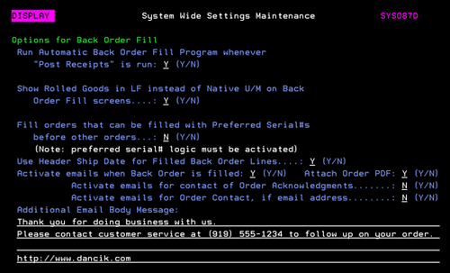 These settings support the automatic updating of back order ETA dates based on open purchase orders and manufacturer production schedules. These automatic back order date changes can be set to run nightly and/or on demand via menu option PUR 19.