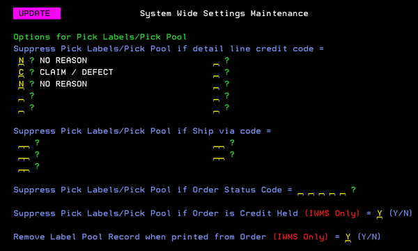 This setting enables you to automatically suppress pick labels or pick pool entries for certain types of orders. This is particularly important for “Credit and Re-bill” orders, in which the debit line is for billing purposes only, and should not be re-shipped. Credits do not automatically generate pick labels or entries in the pick pool. This feature is meant to manage debit order lines that should not be physically handled.