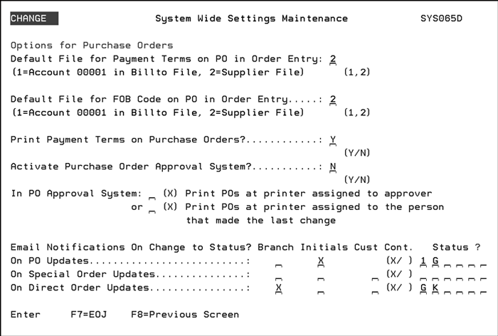 Note: The above two settings also apply to the Update Shipping Data By Vessel Name program (menu option PUR 15). If a setting is activated, the corresponding Customer Back order status/ship date is also updated. The customer back order is only updated until it is filled. Changes to the purchase order dates or status do not affect back orders once they are filled.