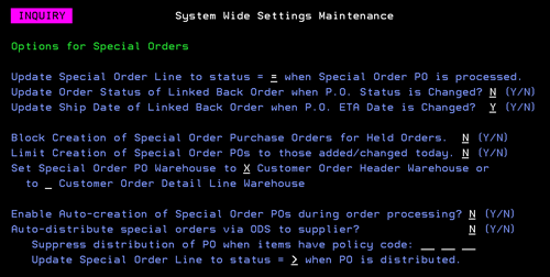 We recommend that the first time this setting is activated you run PUR 4 - Print Special Order Purchases. Then review the spoolfile to check on the special POs that were created. If the Special PO is not current, you can go into menu option PUR 11 Cancel &/or Change Open Orders &/or POs to cancel or void them.