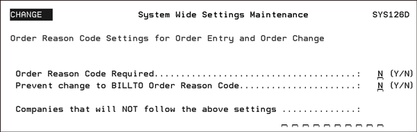 Enter a “Y” in the Order Reason Code Required setting to make the entry of an Order Reason Code Mandatory during Order Entry and Order Change. If this setting is activated, the default reason code is pulled in from the Reason CD field in the Billto File; if one is assigned. Use the setting, Companies that will NOT follow the above settings, to designate the companies where the use of Order Reason Codes is NOT mandatory. |