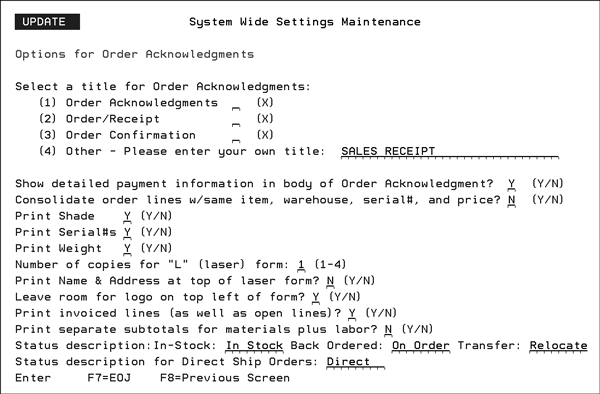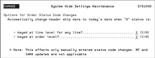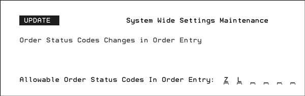 - Enter a valid order status code. To display a listing of valid codes, enter a “?” in the field and press Enter. - If the setting is left blank, the default, then the order/line status remains at the current status. Note: Order Status codes are created and maintained through the Order & Serial# Status Codes program (menu option SET 7). - When a packing list is printed the order/line is automatically updated to reflect the new status. Note: The order’s notepad is also updated to note the change of order status.