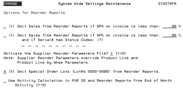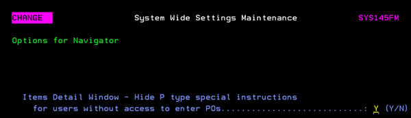 This option controls system-wide settings for negative inventory. You can control enable or disable entries that create a negative onhand balance inventory in the three Inventory related programs: A Y entry in these fields causes the respective program to issue an error message instead of allowing the inventory onhand balance to become negative. |