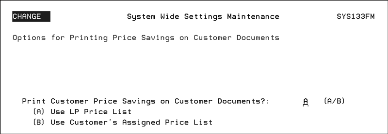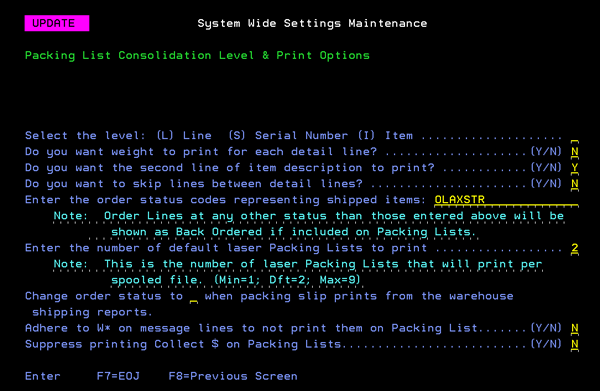 Defines the level of detail appearing on the packing lists. If this option is left blank, packing lists show only lines with status codes S as being shipped, and show all other lines as “back ordered”. If you are currently using packing lists, and want lines to show as shipped even if not as status S, enter status codes on this screen. If the new status codes parameter is filled in, packing lists can show lines other than those shipped and indicate whether or not each individual line was shipped. For example, if you enter S and A for this parameter, only S and A items are listed as shipped on packing lists, but items not status S or A can be listed on the packing list showing as back ordered. This option assists your customers in reconciling open items on their purchase orders to your packing lists.