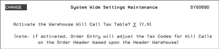 Place an Y in the Activate the Warehouse Will Call Tax Table field to activate the table. If activated, Order Entry uses the information contained in the Will Call Tax Table to assess taxes based on the business address of the customer as well as the address of the warehouse. If this feature is not activated, Order Entry uses the tax codes as defined in the warehouse file for will call (customer pick-up) orders. |