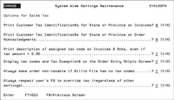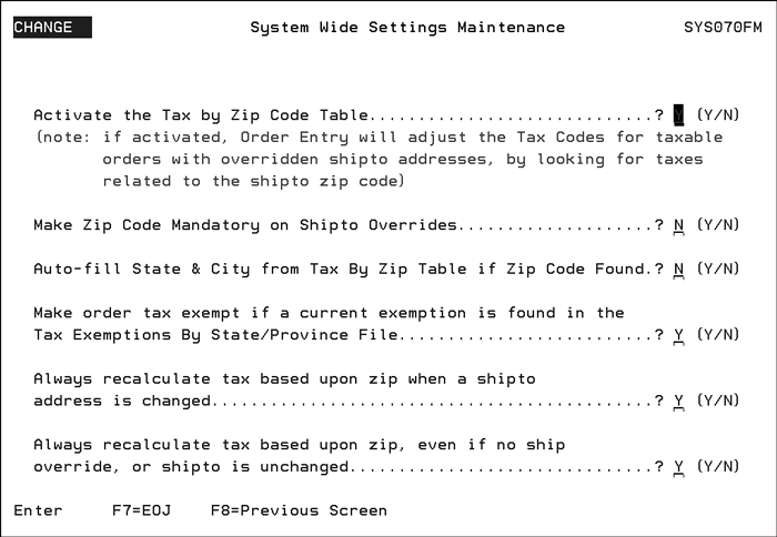 The last two options are intended for companies that use the Tax By Zip Code Table (FIL 43), and store tax exemption numbers in the Tax Exceptions File (SYS 605).