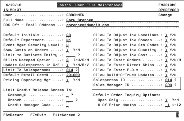 Restrict Order views in My Sales - If set to “N” the display of orders is not restricted. If set to “Y”, the system compares the user’s logon information to the following areas to see there is a match on the order’s salesperson on the order; if there is a match the order/order line is displayed: