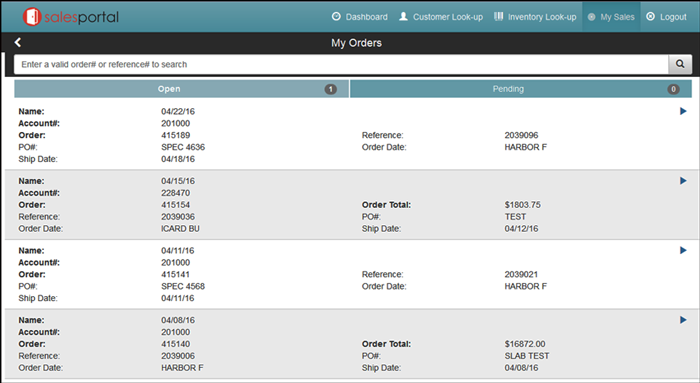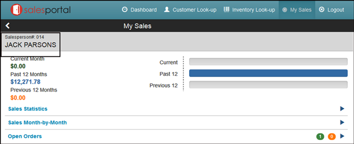 In the example shown above, the salesperson has access to orders entered from three other salespeople. Restrict Order views in Customer Information - If set to “N” the display of orders is not restricted. If set to “Y”, restrict the orders under the same guidelines as the setting Restrict Order views in My Sales. Example Logon to the Sales Portal and click on the My Sales tab. Notice in this example the salesperson is Jack Parsons (code 014).