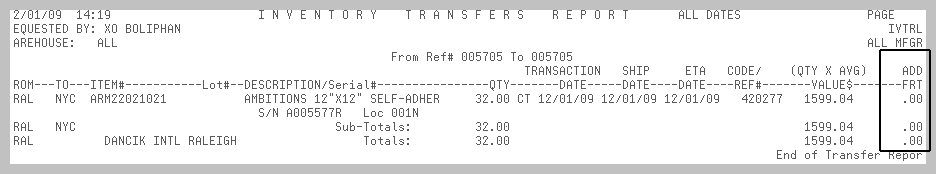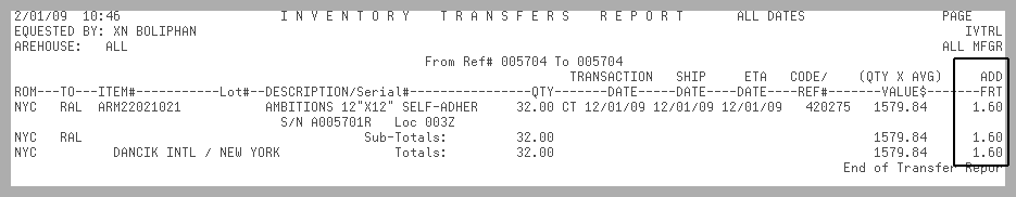 Show additional interwarehouse freight in separate column on inventory registers - This setting affects the Receipts Update option (INB 5). If the setting is activated, it separates the freight, which then appears on the Transfer Report (RIV 7) in a separate column. If set to “N”, the Add'l Freight column is zero, and the additional freight is added into the total value column. Note: Additional freight is always broken out separately for customer transfers.