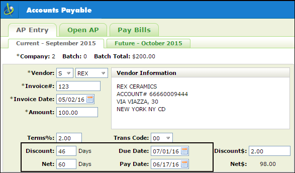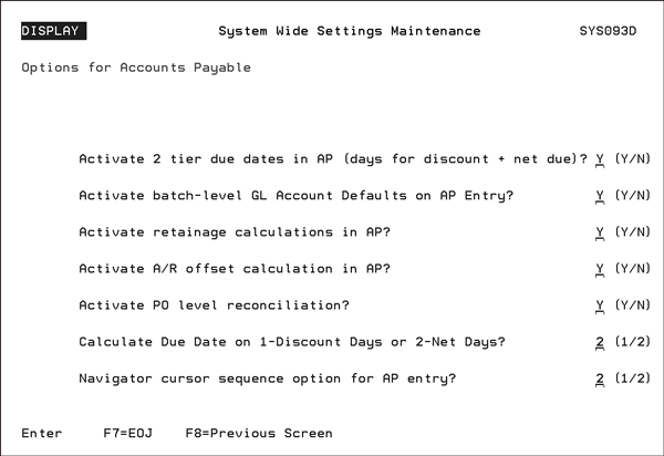 If this setting is activated, the field Paymt Terms 00000 % 000 Days Net 000 appears in the Supplier File (FIL 3), the Vendor File (FIL 14), and in the AP Entry program (AP1). It also directs Night Jobs to automatically process due date changes when the “due for discount date” passes. Note - You can run a report, via option SYS 414, at any time that can list and update AP Invoices that are past their discount due dates.
