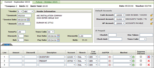 Sequence 1 (the default) moves the cursor through the following sequence: Company # Batch # Vendor/Supplier Qualifier Vendor/Supplier Code Invoice # Invoice Date Invoice amount (Tab out of this field defaults terms code from supplier file and updates due date and pay date as well when supplier has no terms information). Line Detail Amounts Sequence 2 - moves the cursor through the following sequence (differences are highlighted): Company # Batch # Vendor/Supplier Qualifier Vendor/Supplier Code Invoice #: Invoice Date Invoice amount Terms % Discount (Days) Net (Days) Due Date Pay Date |